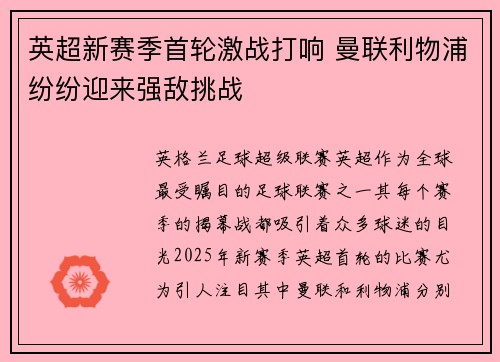 英格兰足球超级联赛(英超)作为全球最受瞩目的足球联赛之一,其每个赛季的揭幕战都吸引着众多球迷的目光。2025年新赛季英超首轮的比赛尤为引人注目,其中曼联和利物浦分别迎来了强敌的挑战,注定为新赛季奠定了火热的开局。曼联将在主场迎战劲敌切尔西,而利物浦则将前往阿森纳的主场挑战强敌。这两支传统豪门都面临着极具挑战性的首轮赛事,不仅需要展现出球队的战术水平,更要展现出球员们的竞技状态。本文将从以下四个方面详细分析英超新赛季首轮的激烈对决,重点探讨曼联与利物浦在面对强敌时的表现与挑战:1)曼联与切尔西的对决,2)利物浦与阿森纳的较量,3)新赛季英超赛季整体竞争格局,4)曼联与利物浦的赛季前景分析。通过对这些方面的深入探讨,本文将帮助读者全面了解英超新赛季首轮的激战局面,以及曼联和利物浦的未来发展趋势。