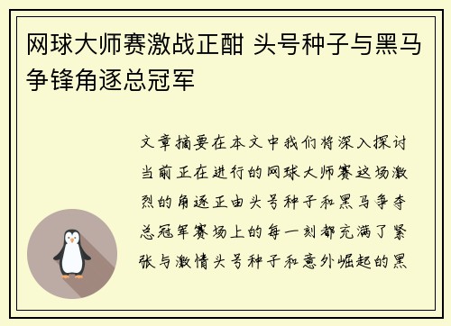 在本文中,我们将深入探讨当前正在进行的网球大师赛,这场激烈的角逐正由头号种子和黑马争夺总冠军。赛场上的每一刻都充满了紧张与激情,头号种子和意外崛起的黑马之间的对决尤为引人注目。他们的每一场比赛都决定着谁能够站在最高的领奖台上,成为冠军的终极胜者。