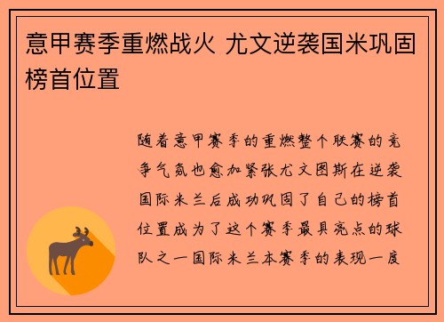 随着意甲赛季的重燃,整个联赛的竞争气氛也愈加紧张。尤文图斯在逆袭国际米兰后成功巩固了自己的榜首位置,成为了这个赛季最具亮点的球队之一。国际米兰本赛季的表现一度让球迷充满期待,但尤文图斯的强势反扑,证明了他们依然是意甲最强的劲旅之一。本文将围绕尤文图斯如何成功逆袭国际米兰并牢牢占据榜首位置,从四个方面进行详细阐述:一、尤文图斯的战术调整与团队协作;二、国际米兰的失误与反思;三、尤文图斯球员的个人表现;四、意甲赛季的激烈竞争态势。通过这些方面的分析,我们将对尤文图斯在赛季中的成功进行全面的解读,并探讨他们如何保持优势,继续在联赛中占据统治地位。