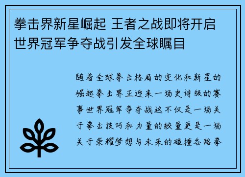 随着全球拳击格局的变化和新星的崛起,拳击界正迎来一场史诗级的赛事——世界冠军争夺战。这不仅是一场关于拳击技巧和力量的较量,更是一场关于荣耀、梦想与未来的碰撞。各路拳击新星将在这场战斗中一决高下,争夺世界拳击最顶尖的荣誉。与此同时,随着竞技水平的日益提升,拳击的观赏性和竞技性也达到了一个前所未有的高度。这场比赛引发了全球拳迷的广泛关注,所有人都期待着新一代拳击巨星的诞生。本文将从四个方面详细探讨这场王者之战的深远意义,以及拳击界新星崛起对未来拳击格局的影响。