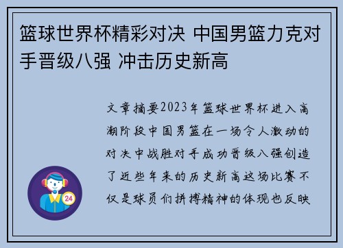 通过此次篮球世界杯的精彩对决,中国男篮展现了强大的团队配合和个体能力,成功击败对手,晋级八强,打破了历史纪录。比赛中,球队不仅依靠巧妙的战术调整,还通过球员们的出色发挥和关键时刻的心理素质,力压对手,展示了中国篮球的崭新面貌。